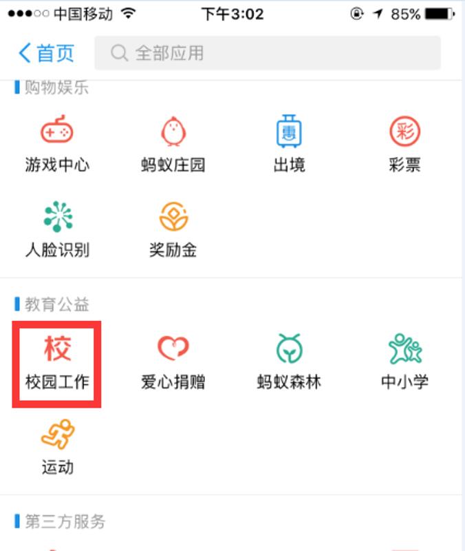 1、登录支付宝首页,选择【校园工作】