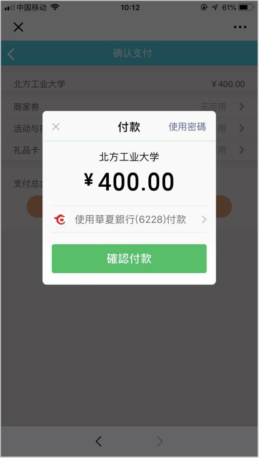 第五步:点击“下一步”,选择微信支付,输入支付密码,完成支付。