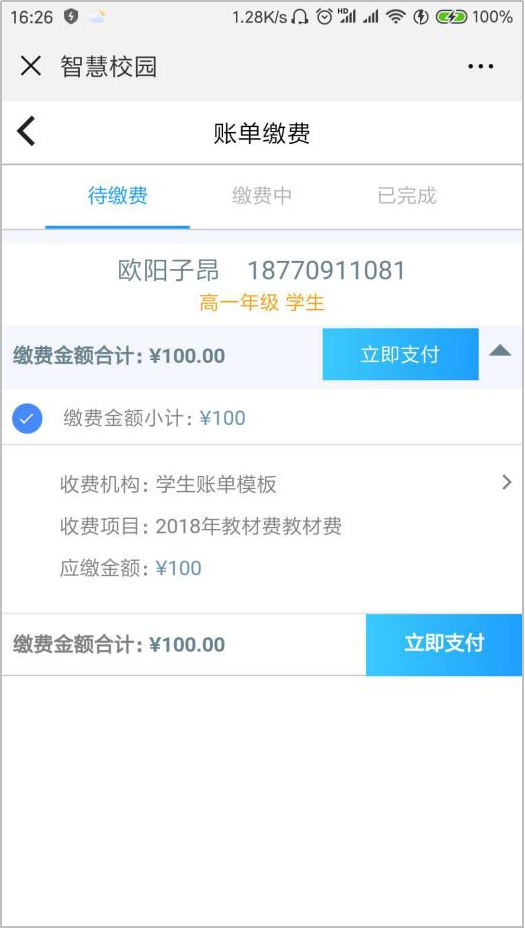 第四步:勾选该帐单,点击“立即支付”,确认订单后点击“提交”。
