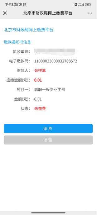 第五步:进入财政缴费页面,等待几秒待缴款码生成,点击刷新即可查看到缴款通知书,点击“缴费”。