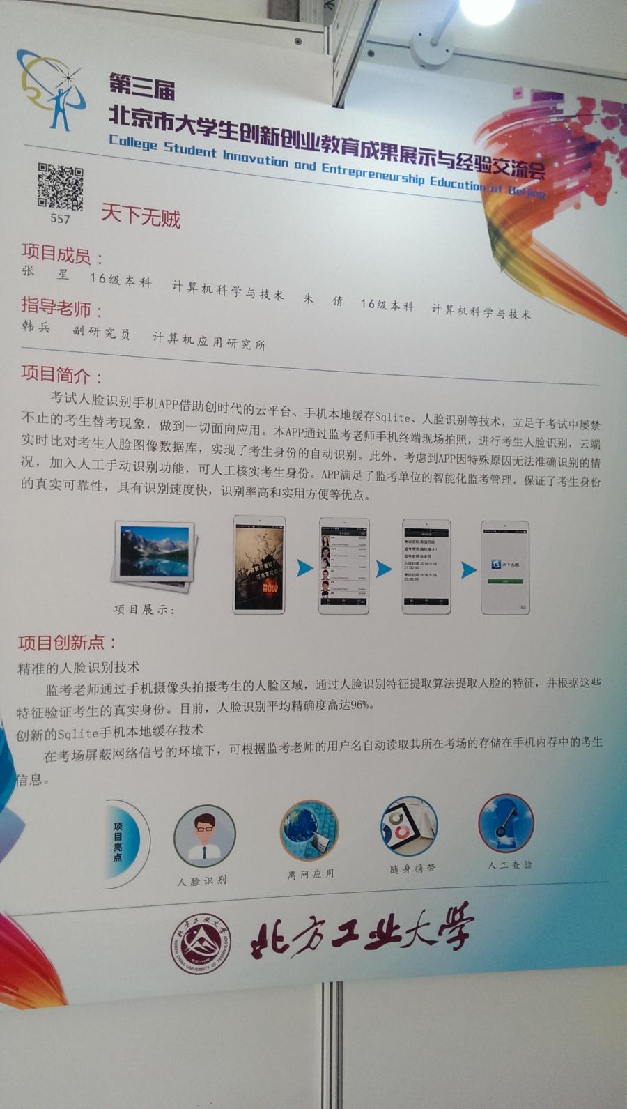 由我校教师韩兵老师指导,Beat365官网2016级计算机科学与技术专业学生张星、朱倩研发的“天下无贼”——考试人脸识别手机APP项目应邀参加此次展出。前来参观的部分师生对此项目产生了兴趣,并在现场进行了亲身体验。此次参展展示了我校Beat365正版唯一官网必一学生的计算机设计应用水平,对广大在校生产生了鼓舞作用。此前该项目已荣获2016年北京高等学校继续教育大学生计算机设计应用竞赛二等奖。