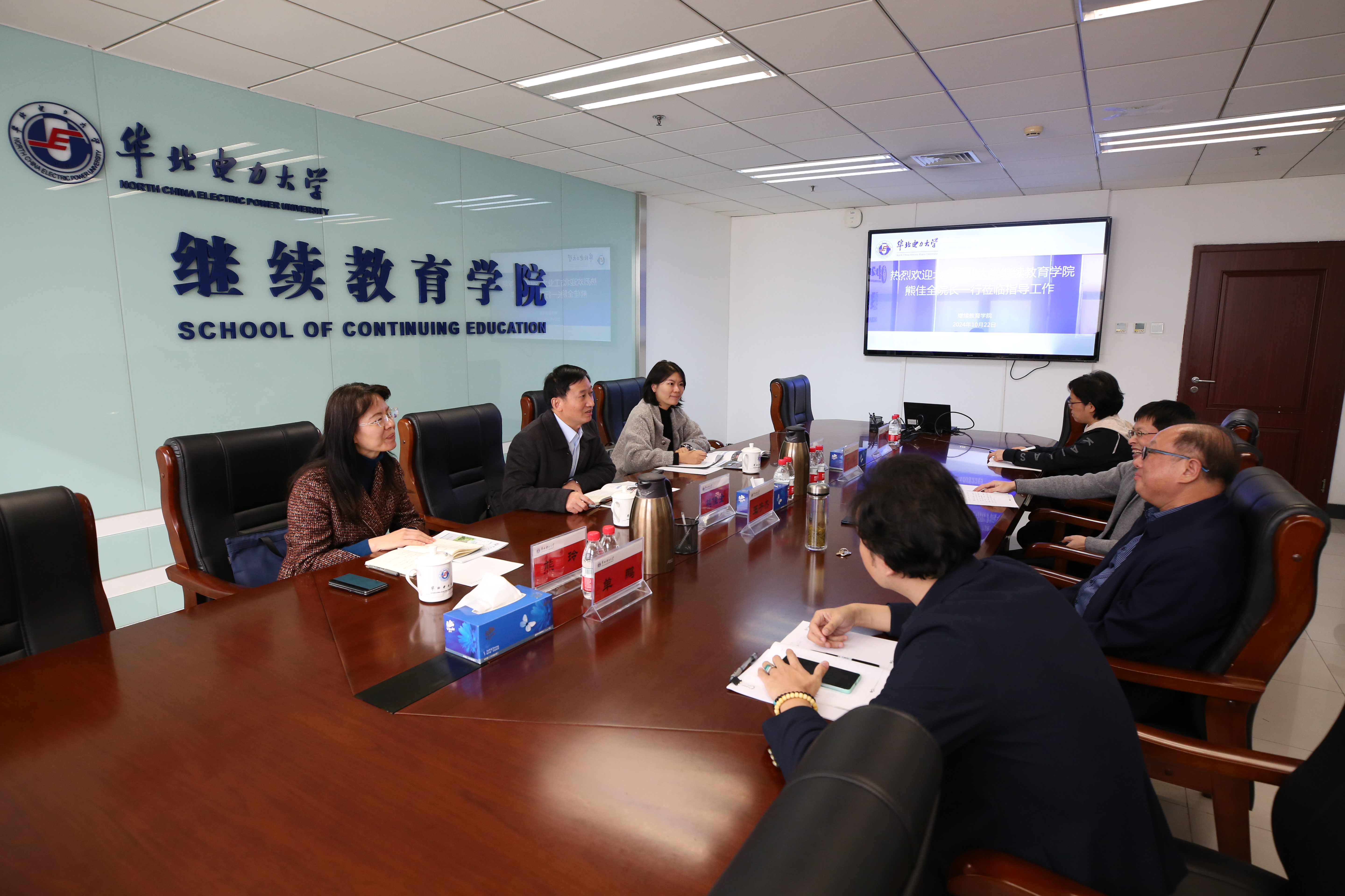 10月22日下午,Beat365正版唯一官网必一院长熊佳全、副院长熊玲等一行三人赴华北电力大学Beat365正版唯一官网必一调研交流。华北电力大学Beat365正版唯一官网必一院长王子杰、副院长丁锐等出席座谈会。